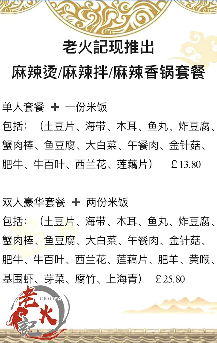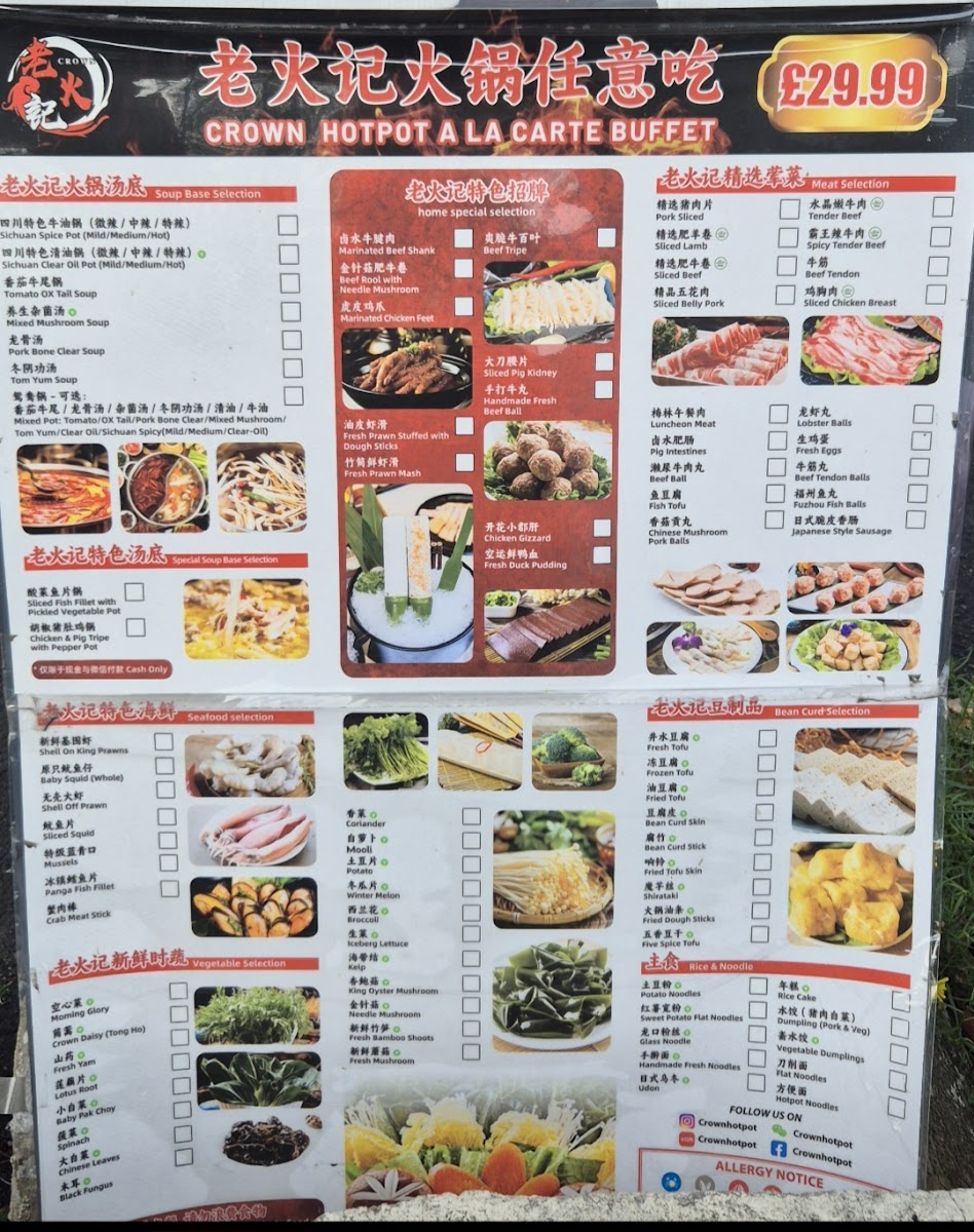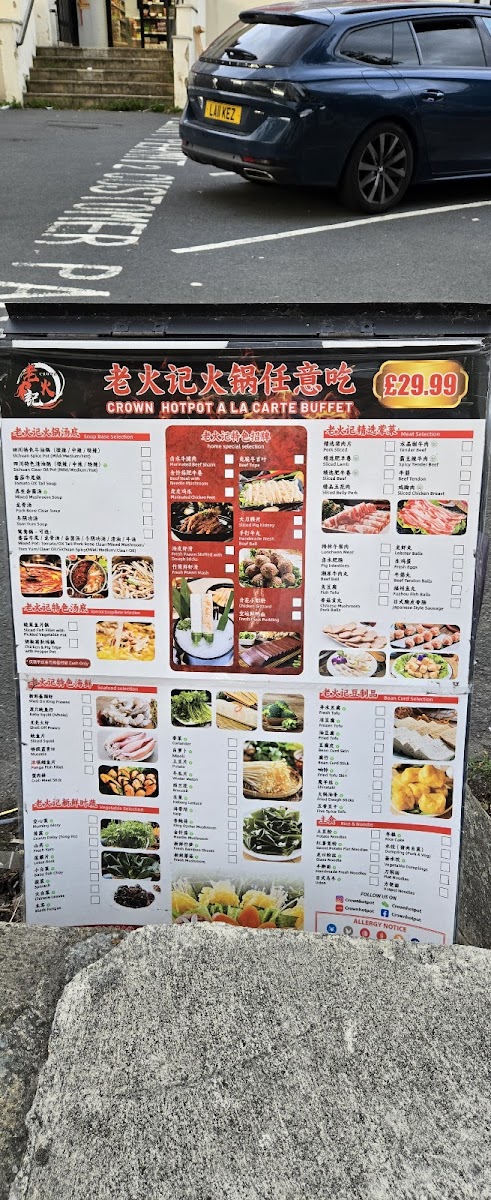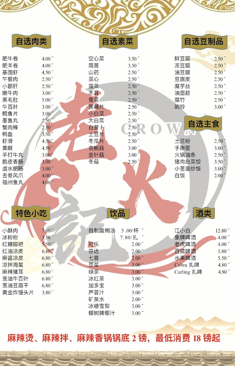 From a reviewer’s perspective, the menu at Crown Chinese Hotpot offers a wide and satisfying variety of Sichuan-style dishes and comforting staples, making it a great spot for both hotpot lovers and those who prefer cooked dishes. The spicy section stands out with Hot Pot Dishes 麻辣烫 and Spicy Dry Pot 麻辣香锅, while the seafood selection such as Boiled Spicy Fish Fillets 水煮鱼片, Pickled Fish 酸菜鱼, and Scalded Shrimp 白灼虾 adds depth to the menu. Cold starters like Mixed Spicy Skewers 钵钵鸡, Spicy Beef 麻辣牛腱, and Chilled Pork Ears 凉拌猪耳 provide bold flavors, and hearty stir-fries including Mao Blood Flourishing 毛血旺, Poached Sliced Pork Vegetable In Hot Chili Oil 水煮肉, and Fried Chicken With Dry Chilli Sichuan Pepper 辣子鸡 are perfect for sharing. For staple dishes, options such as Chicken Fried Rice 鸡肉炒饭, Prawn Fried Rice 大虾炒饭, and Filet Mignon Udon With Black Pepper 黑椒牛肉炒乌冬 are filling and flavorful. The menu also includes lighter vegetable dishes like Garlic Granules Broccoli Stir Fry 蒜蓉西兰花 and soups such as Fried Egg Tomato Soup 番茄煎蛋汤. Rice bowls like Kung Pao Chicken With Rice 宫保鸡丁饭 and snacks like Crispy Pork Belly 现炸小酥肉 round out the selection, while drinks such as Homemade Plum Juice 自制酸梅汤 provide a refreshing finish. Overall, the menu is diverse, spice-forward, and well-suited for both individual meals and group dining.