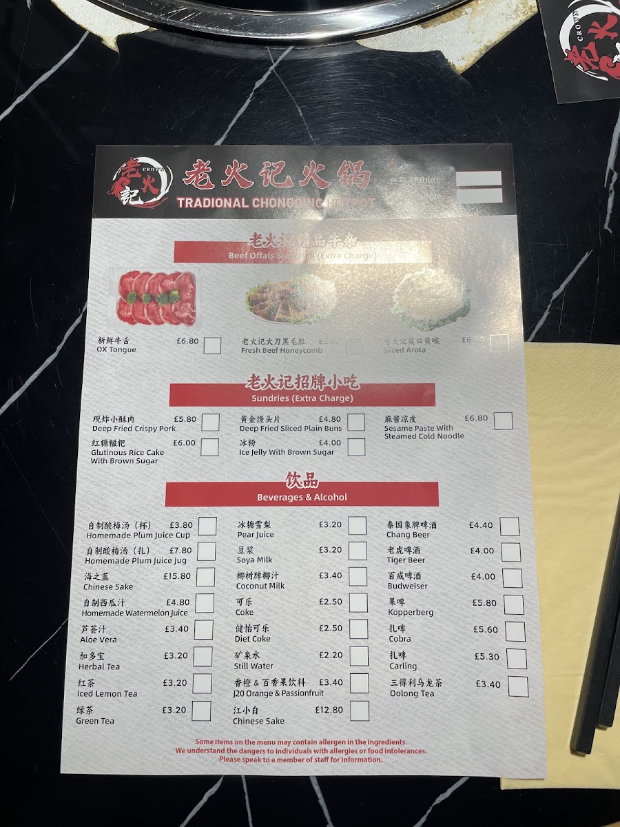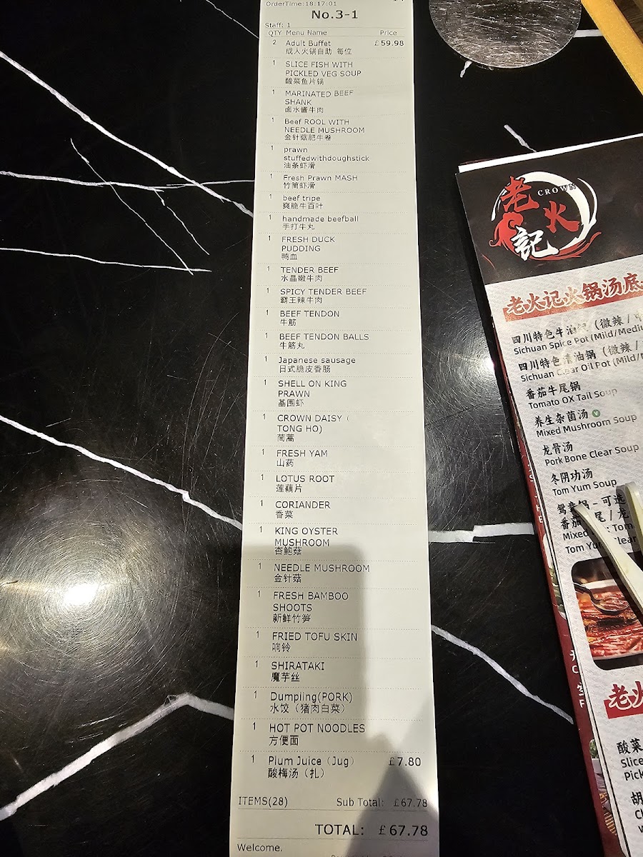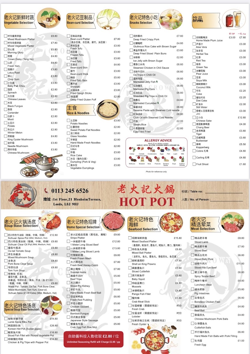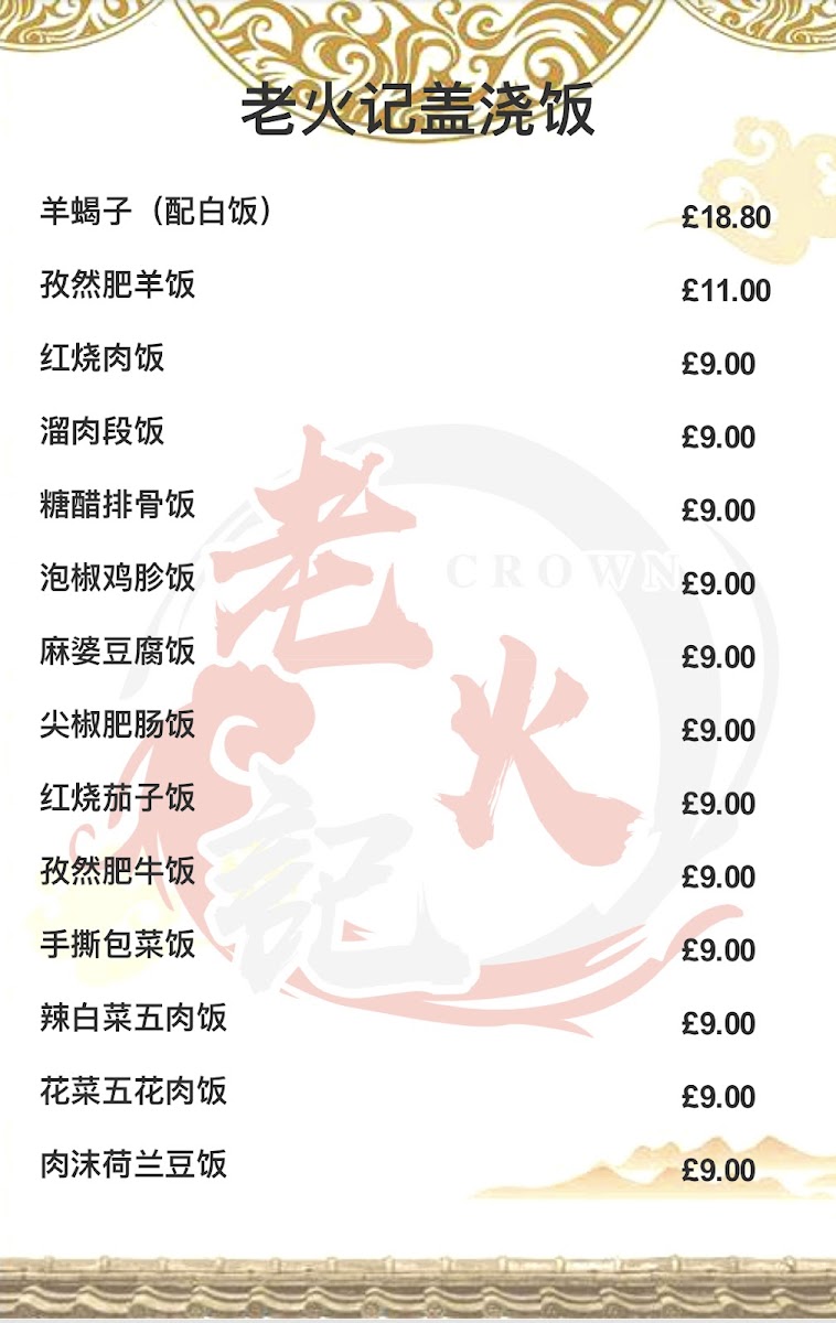 From a reviewer’s perspective, the menu at Crown Chinese Hotpot offers a wide and satisfying variety of Sichuan-style dishes and comforting staples, making it a great spot for both hotpot lovers and those who prefer cooked dishes. The spicy section stands out with Hot Pot Dishes 麻辣烫 and Spicy Dry Pot 麻辣香锅, while the seafood selection such as Boiled Spicy Fish Fillets 水煮鱼片, Pickled Fish 酸菜鱼, and Scalded Shrimp 白灼虾 adds depth to the menu. Cold starters like Mixed Spicy Skewers 钵钵鸡, Spicy Beef 麻辣牛腱, and Chilled Pork Ears 凉拌猪耳 provide bold flavors, and hearty stir-fries including Mao Blood Flourishing 毛血旺, Poached Sliced Pork Vegetable In Hot Chili Oil 水煮肉, and Fried Chicken With Dry Chilli Sichuan Pepper 辣子鸡 are perfect for sharing. For staple dishes, options such as Chicken Fried Rice 鸡肉炒饭, Prawn Fried Rice 大虾炒饭, and Filet Mignon Udon With Black Pepper 黑椒牛肉炒乌冬 are filling and flavorful. The menu also includes lighter vegetable dishes like Garlic Granules Broccoli Stir Fry 蒜蓉西兰花 and soups such as Fried Egg Tomato Soup 番茄煎蛋汤. Rice bowls like Kung Pao Chicken With Rice 宫保鸡丁饭 and snacks like Crispy Pork Belly 现炸小酥肉 round out the selection, while drinks such as Homemade Plum Juice 自制酸梅汤 provide a refreshing finish. Overall, the menu is diverse, spice-forward, and well-suited for both individual meals and group dining.